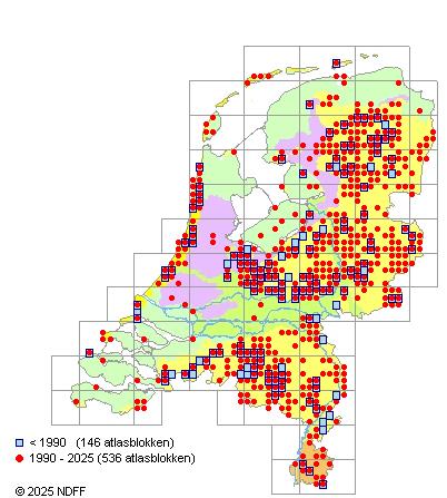 Het aantal atlasblokken (5x5 km) waarin de soort is gemeld binnen een periode van vijf jaar (vanaf 1980) of twintig jaar. Niet gecorrigeerd voor waarnemersinspanning en het aantal doorgegeven waarnemingen kan sterk variëren per periode, dus een trend in verspreiding kan hier niet direct uit worden afgelezen. Het opgegeven jaartal is het eerste jaar van de periode. Bron: gevalideerde waarnemingen uit de NDFF.