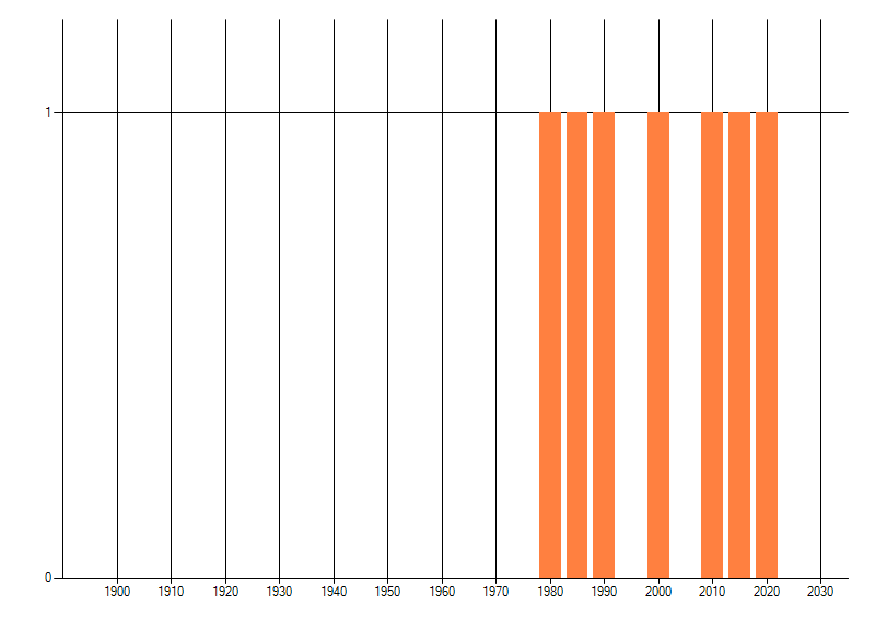 Het aantal atlasblokken (5x5 km) waarin de soort is gemeld binnen een periode van vijf jaar (vanaf 1980) of twintig jaar. Niet gecorrigeerd voor waarnemersinspanning en het aantal doorgegeven waarnemingen kan sterk variëren per periode, dus een trend in verspreiding kan hier niet direct uit worden afgelezen. Het opgegeven jaartal is het eerste jaar van de periode. Bron: gevalideerde waarnemingen uit de NDFF.