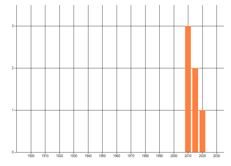 Het aantal atlasblokken (5x5 km) waarin de soort is gemeld binnen een periode van vijf jaar (vanaf 1980) of twintig jaar. Niet gecorrigeerd voor waarnemersinspanning en het aantal doorgegeven waarnemingen kan sterk variëren per periode, dus een trend in verspreiding kan hier niet direct uit worden afgelezen. Het opgegeven jaartal is het eerste jaar van de periode. Bron: gevalideerde waarnemingen uit de NDFF.