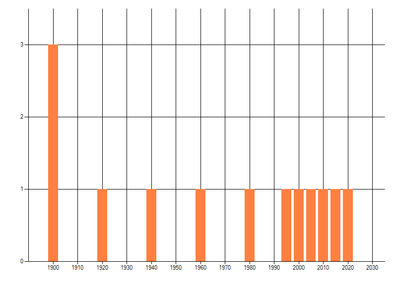 Het aantal atlasblokken (5x5 km) waarin de soort is gemeld binnen een periode van vijf jaar (vanaf 1980) of twintig jaar. Niet gecorrigeerd voor waarnemersinspanning en het aantal doorgegeven waarnemingen kan sterk variƫren per periode, dus een trend in verspreiding kan hier niet direct uit worden afgelezen. Het opgegeven jaartal is het eerste jaar van de periode. Bron: gevalideerde waarnemingen uit de NDFF.