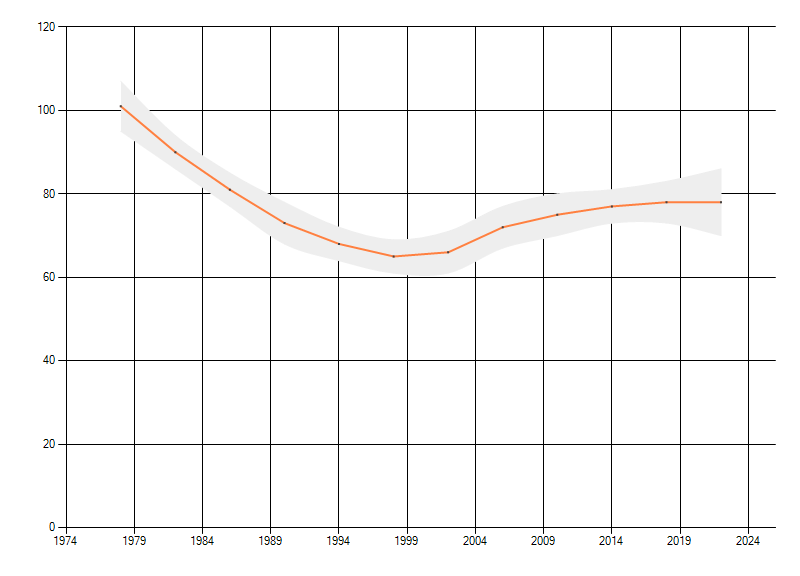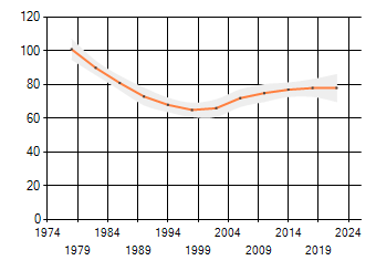 Gemiddelde trend van het aantal kilometerhokken waarin de soort voorkomt, weergegeven als indexcijfer (1975-1978 = 100).