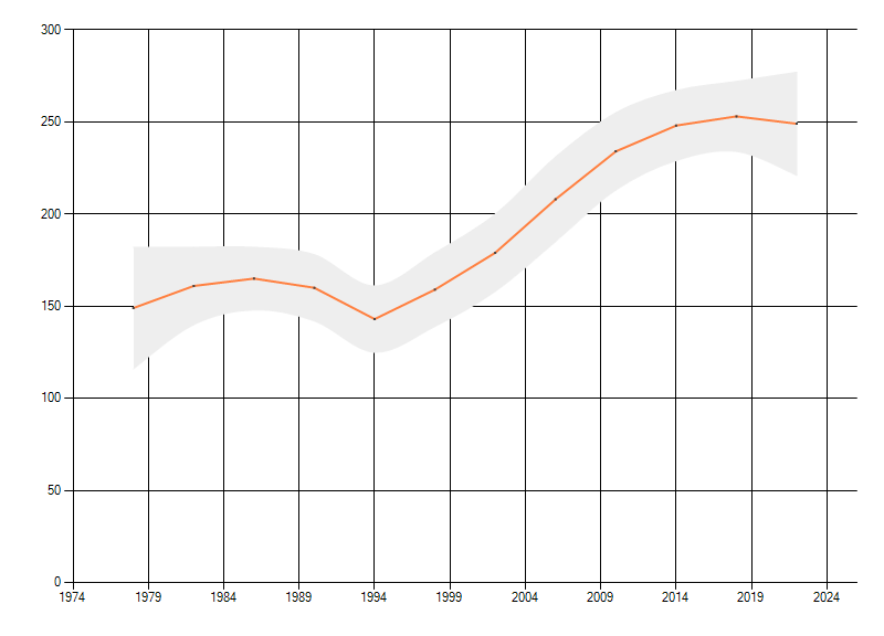 Gemiddelde trend van het aantal kilometerhokken waarin de soort voorkomt, weergegeven als indexcijfer (1975-1978 = 100). De trend is gecorrigeerd voor waarnemersinspanning en geeft de relatieve verandering in het aantal bezette kilometerhokken weer. Voor de berekening worden de data per periode van vier jaar samengenomen. In de grafiek correspondeert ieder punt met het laatste jaar van zo'n periode.