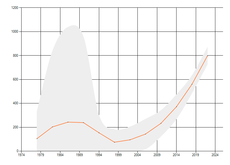 Gemiddelde trend van het aantal kilometerhokken waarin de soort voorkomt, weergegeven als indexcijfer (1975-1978 = 100).