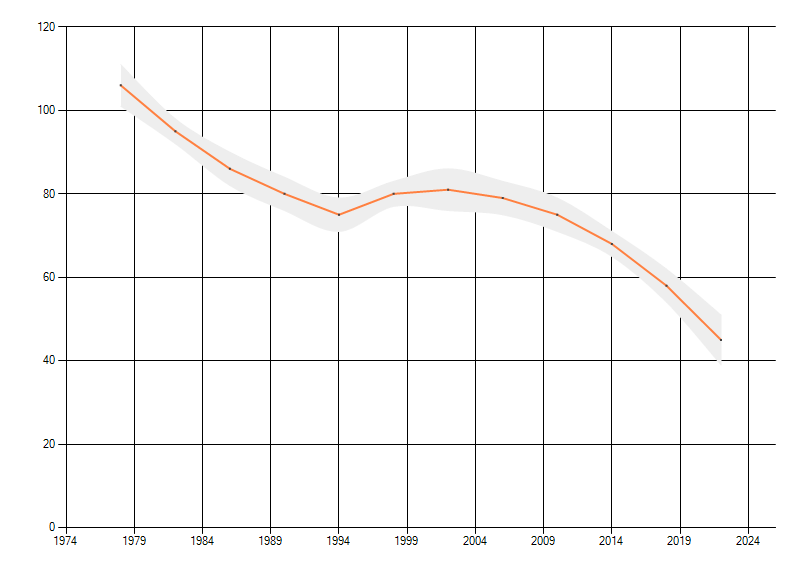 Gemiddelde trend van het aantal kilometerhokken waarin de soort voorkomt, weergegeven als indexcijfer (1975-1978 = 100). De trend is gecorrigeerd voor waarnemersinspanning en geeft de relatieve verandering in het aantal bezette kilometerhokken weer. Voor de berekening worden de data per periode van vier jaar samengenomen. In de grafiek correspondeert ieder punt met het laatste jaar van zo'n periode.