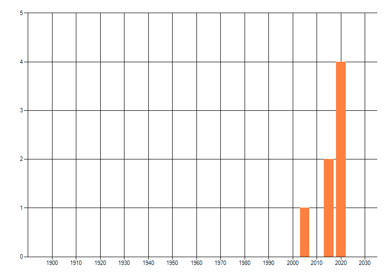 Het aantal atlasblokken (5x5 km) waarin de soort is gemeld binnen een periode van vijf jaar (vanaf 1980) of twintig jaar. Niet gecorrigeerd voor waarnemersinspanning en het aantal doorgegeven waarnemingen kan sterk variëren per periode, dus een trend in verspreiding kan hier niet direct uit worden afgelezen. Het opgegeven jaartal is het eerste jaar van de periode. Bron: gevalideerde waarnemingen uit de NDFF.