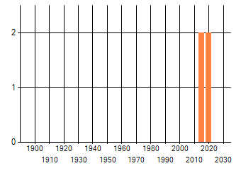 Het aantal atlasblokken (5x5 km) waarin de soort is gemeld binnen een periode van vijf jaar (vanaf 1980) of twintig jaar. Niet gecorrigeerd voor waarnemersinspanning en het aantal doorgegeven waarnemingen kan sterk variëren per periode, dus een trend in verspreiding kan hier niet direct uit worden afgelezen. Het opgegeven jaartal is het eerste jaar van de periode. Bron: gevalideerde waarnemingen uit de NDFF.