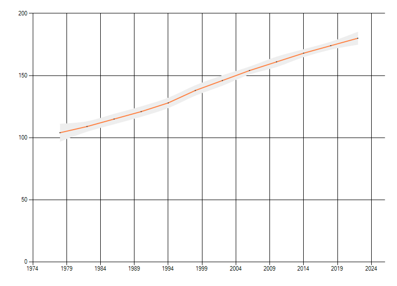 Gemiddelde trend van het aantal kilometerhokken waarin de soort voorkomt, weergegeven als indexcijfer (1975-1978 = 100).