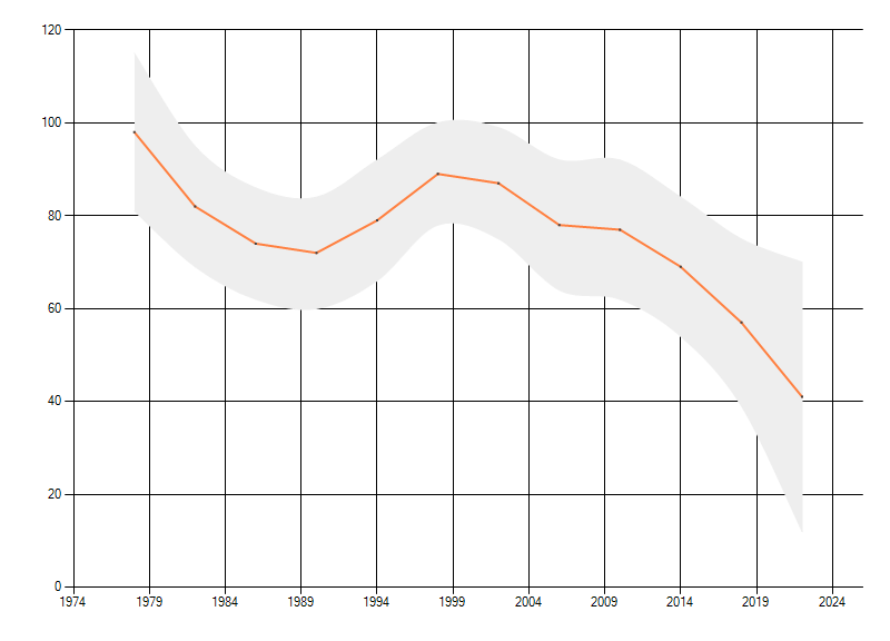 Gemiddelde trend van het aantal kilometerhokken waarin de soort voorkomt, weergegeven als indexcijfer (1975-1978 = 100).