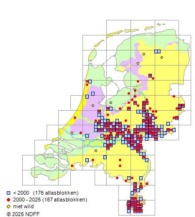 CC BY-NC-SA 3.0 NLVerspreidingNederlandVrij zeldzaam in het rivierengebied en op enkele plaatsen in het oosten en midden, zeldzaam in Zuid-Limburg en zeer zeldzaam in Drenthe.