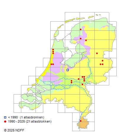 Het aantal atlasblokken (5x5 km) waarin de soort is gemeld binnen een periode van vijf jaar (vanaf 1980) of twintig jaar. Niet gecorrigeerd voor waarnemersinspanning en het aantal doorgegeven waarnemingen kan sterk variëren per periode, dus een trend in verspreiding kan hier niet direct uit worden afgelezen. Het opgegeven jaartal is het eerste jaar van de periode. Bron: gevalideerde waarnemingen uit de NDFF.