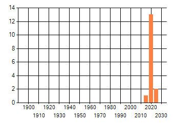 Het aantal atlasblokken (5x5 km) waarin de soort is gemeld binnen een periode van vijf jaar (vanaf 1980) of twintig jaar. Niet gecorrigeerd voor waarnemersinspanning en het aantal doorgegeven waarnemingen kan sterk variëren per periode, dus een trend in verspreiding kan hier niet direct uit worden afgelezen. Het opgegeven jaartal is het eerste jaar van de periode. Bron: gevalideerde waarnemingen uit de NDFF.