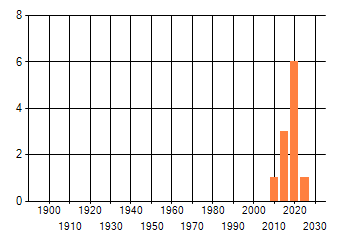 Het aantal atlasblokken (5x5 km) waarin de soort is gemeld binnen een periode van vijf jaar (vanaf 1980) of twintig jaar. Niet gecorrigeerd voor waarnemersinspanning en het aantal doorgegeven waarnemingen kan sterk variëren per periode, dus een trend in verspreiding kan hier niet direct uit worden afgelezen. Het opgegeven jaartal is het eerste jaar van de periode. Bron: gevalideerde waarnemingen uit de NDFF.