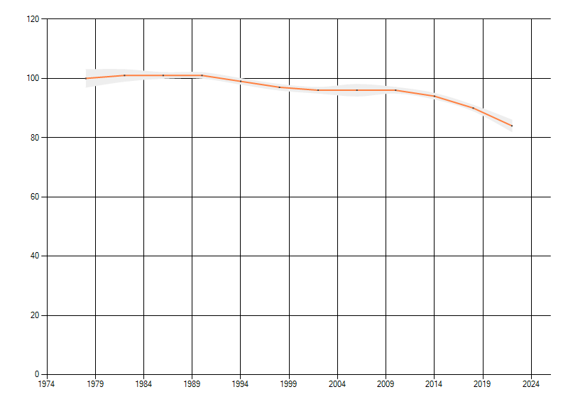 Gemiddelde trend van het aantal kilometerhokken waarin de soort voorkomt, weergegeven als indexcijfer (1975-1978 = 100). De trend is gecorrigeerd voor waarnemersinspanning en geeft de relatieve verandering in het aantal bezette kilometerhokken weer. Voor de berekening worden de data per periode van vier jaar samengenomen. In de grafiek correspondeert ieder punt met het laatste jaar van zo'n periode.