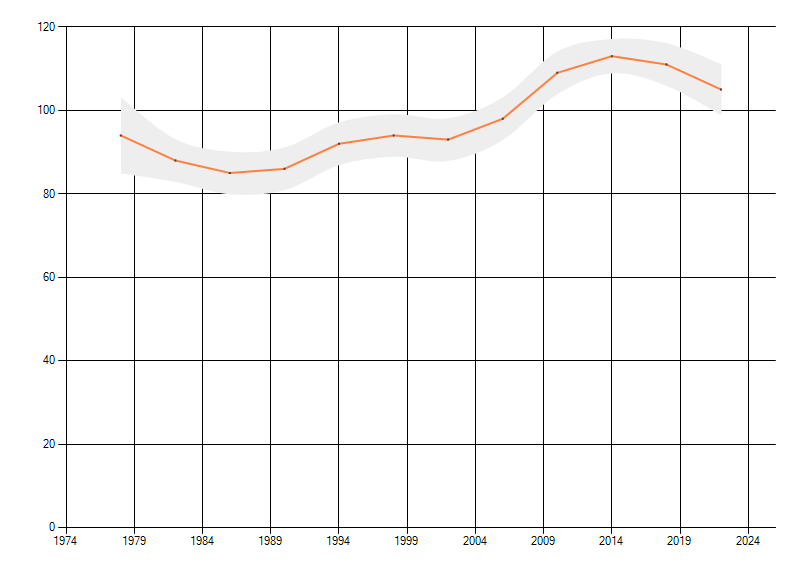 Gemiddelde trend van het aantal kilometerhokken waarin de soort voorkomt, weergegeven als indexcijfer (1975-1978 = 100).