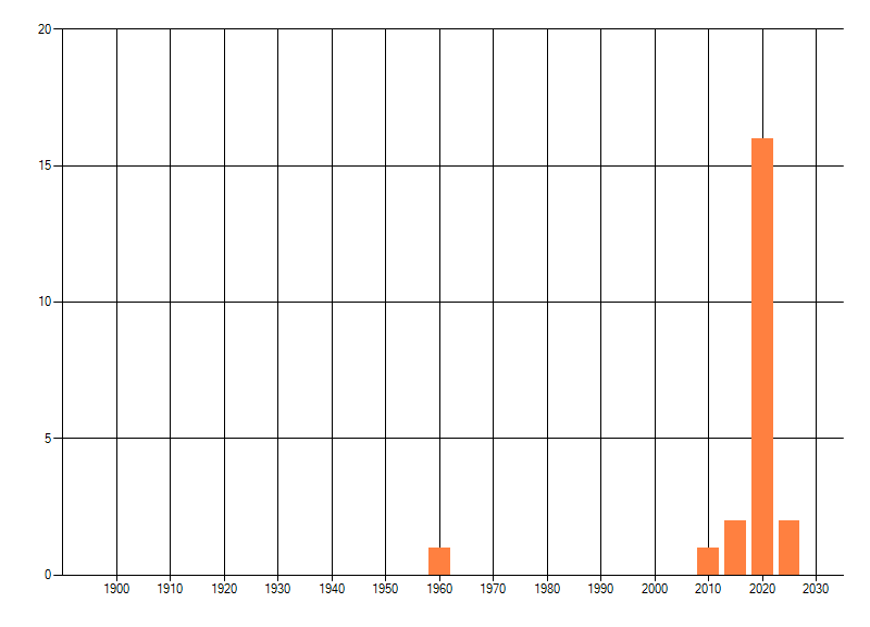 Het aantal atlasblokken (5x5 km) waarin de soort is gemeld binnen een periode van vijf jaar (vanaf 1980) of twintig jaar. Niet gecorrigeerd voor waarnemersinspanning en het aantal doorgegeven waarnemingen kan sterk variëren per periode, dus een trend in verspreiding kan hier niet direct uit worden afgelezen. Het opgegeven jaartal is het eerste jaar van de periode. Bron: gevalideerde waarnemingen uit de NDFF.