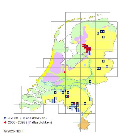Gemiddelde trend van het aantal kilometerhokken waarin de soort voorkomt, weergegeven als indexcijfer (1975-1978 = 100). De trend is gecorrigeerd voor waarnemersinspanning en geeft de relatieve verandering in het aantal bezette kilometerhokken weer. Voor de berekening worden de data per periode van vier jaar samengenomen. In de grafiek correspondeert ieder punt met het laatste jaar van zo'n periode.