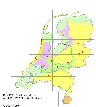 Het aantal atlasblokken (5x5 km) waarin de soort is gemeld binnen een periode van vijf jaar (vanaf 1980) of twintig jaar. Niet gecorrigeerd voor waarnemersinspanning en het aantal doorgegeven waarnemingen kan sterk variëren per periode, dus een trend in verspreiding kan hier niet direct uit worden afgelezen. Het opgegeven jaartal is het eerste jaar van de periode. Bron: gevalideerde waarnemingen uit de NDFF.