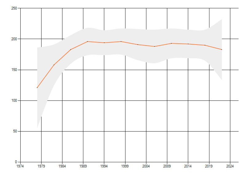 Gemiddelde trend van het aantal kilometerhokken waarin de soort voorkomt, weergegeven als indexcijfer (1975-1978 = 100). De trend is gecorrigeerd voor waarnemersinspanning en geeft de relatieve verandering in het aantal bezette kilometerhokken weer. Voor de berekening worden de data per periode van vier jaar samengenomen. In de grafiek correspondeert ieder punt met het laatste jaar van zo'n periode.