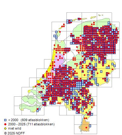 CC BY-NC-SA 3.0 NLVerspreidingNederlandPlaatselijk vrij algemeen in laagveengebieden in Groningen, Fryslân, Noordwest-Overijssel en op de grens van Holland en Utrecht. Ook plaatselijk vrij algemeen in het rivierengebied in Gelderland, in Midden-Nederland, Zuidoost-Fryslân, Drenthe en Noord-Brabant. Zeer zeldzaam elders in Gelderland, in het noordelijk zeekleigebied, in Zeeland en in Flevoland.