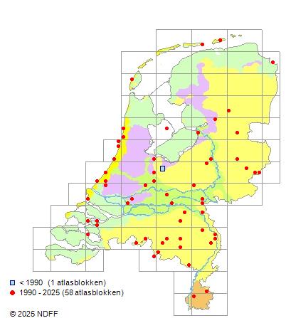 Het aantal atlasblokken (5x5 km) waarin de soort is gemeld binnen een periode van vijf jaar (vanaf 1980) of twintig jaar. Niet gecorrigeerd voor waarnemersinspanning en het aantal doorgegeven waarnemingen kan sterk variëren per periode, dus een trend in verspreiding kan hier niet direct uit worden afgelezen. Het opgegeven jaartal is het eerste jaar van de periode. Bron: gevalideerde waarnemingen uit de NDFF.