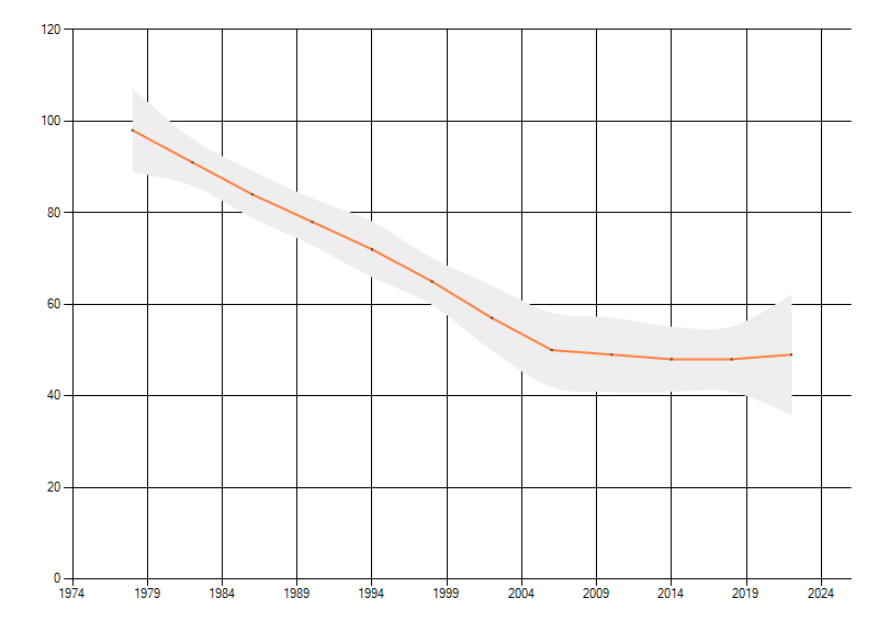 Gemiddelde trend van het aantal kilometerhokken waarin de soort voorkomt, weergegeven als indexcijfer (1975-1978 = 100). De trend is gecorrigeerd voor waarnemersinspanning en geeft de relatieve verandering in het aantal bezette kilometerhokken weer. Voor de berekening worden de data per periode van vier jaar samengenomen. In de grafiek correspondeert ieder punt met het laatste jaar van zo'n periode.