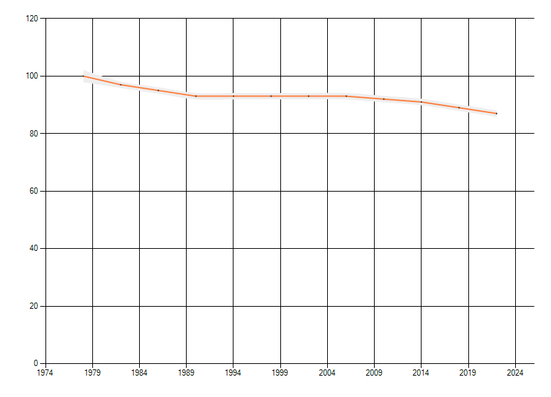 Gemiddelde trend van het aantal kilometerhokken waarin de soort voorkomt, weergegeven als indexcijfer (1975-1978 = 100).
