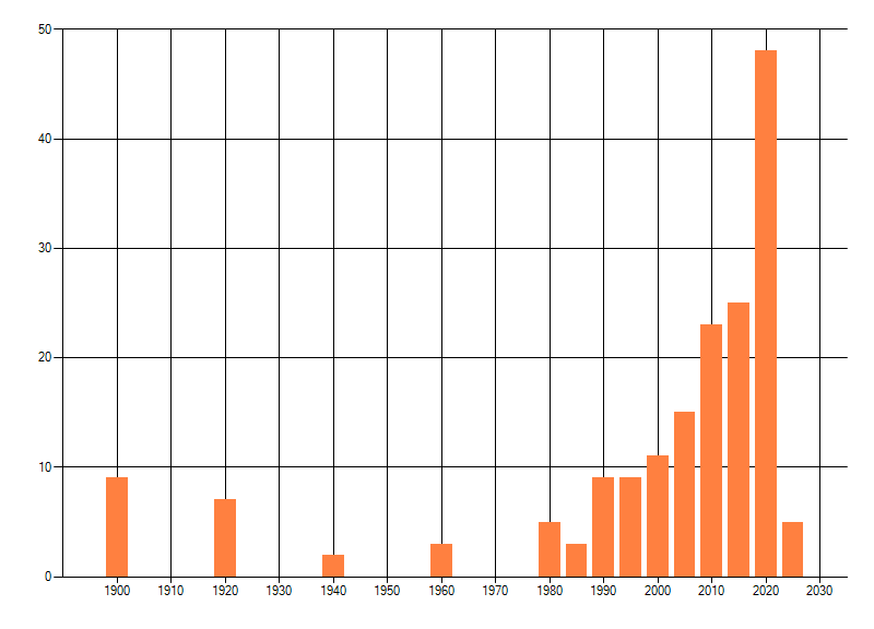 Het aantal atlasblokken (5x5 km) waarin de soort is gemeld binnen een periode van vijf jaar (vanaf 1980) of twintig jaar. Niet gecorrigeerd voor waarnemersinspanning en het aantal doorgegeven waarnemingen kan sterk variëren per periode, dus een trend in verspreiding kan hier niet direct uit worden afgelezen. Het opgegeven jaartal is het eerste jaar van de periode. Bron: gevalideerde waarnemingen uit de NDFF.