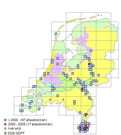 Het aantal atlasblokken (5x5 km) waarin de soort is gemeld binnen een periode van vijf jaar (vanaf 1980) of twintig jaar. Niet gecorrigeerd voor waarnemersinspanning en het aantal doorgegeven waarnemingen kan sterk variëren per periode, dus een trend in verspreiding kan hier niet direct uit worden afgelezen. Het opgegeven jaartal is het eerste jaar van de periode. Bron: gevalideerde waarnemingen uit de NDFF.