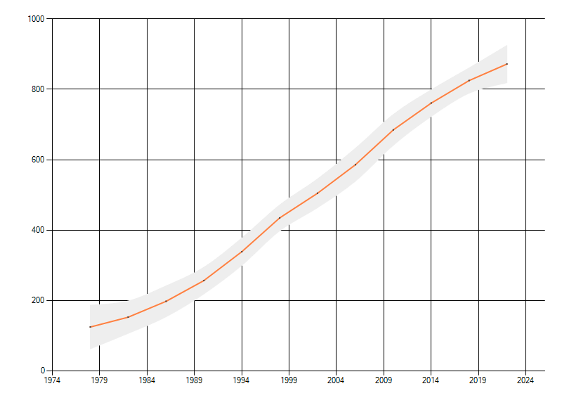 Gemiddelde trend van het aantal kilometerhokken waarin de soort voorkomt, weergegeven als indexcijfer (1975-1978 = 100). De trend is gecorrigeerd voor waarnemersinspanning en geeft de relatieve verandering in het aantal bezette kilometerhokken weer. Voor de berekening worden de data per periode van vier jaar samengenomen. In de grafiek correspondeert ieder punt met het laatste jaar van zo'n periode.