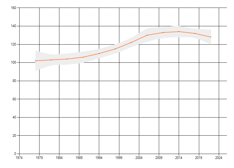 Gemiddelde trend van het aantal kilometerhokken waarin de soort voorkomt, weergegeven als indexcijfer (1975-1978 = 100).
