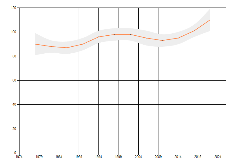 Gemiddelde trend van het aantal kilometerhokken waarin de soort voorkomt, weergegeven als indexcijfer (1975-1978 = 100). De trend is gecorrigeerd voor waarnemersinspanning en geeft de relatieve verandering in het aantal bezette kilometerhokken weer. Voor de berekening worden de data per periode van vier jaar samengenomen. In de grafiek correspondeert ieder punt met het laatste jaar van zo'n periode.