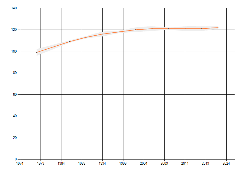 Gemiddelde trend van het aantal kilometerhokken waarin de soort voorkomt, weergegeven als indexcijfer (1975-1978 = 100). De trend is gecorrigeerd voor waarnemersinspanning en geeft de relatieve verandering in het aantal bezette kilometerhokken weer. Voor de berekening worden de data per periode van vier jaar samengenomen. In de grafiek correspondeert ieder punt met het laatste jaar van zo'n periode.