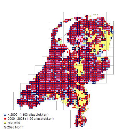 CC BY-NC-SA 3.0 NLVerspreidingNederlandPlaatselijk vrij algemeen in het westen van het land, in laagveengebieden, in het noordelijk zeekleigebied, in het rivierengebied en in de duinen, vrij zeldzaam in het oosten en midden van het land en zeer zeldzaam in Zuid-Limburg.