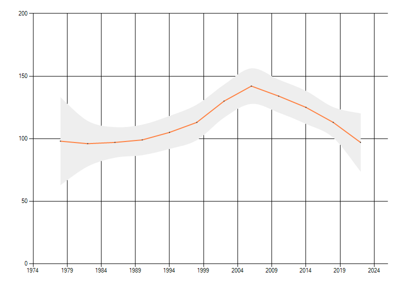 Gemiddelde trend van het aantal kilometerhokken waarin de soort voorkomt, weergegeven als indexcijfer (1975-1978 = 100). De trend is gecorrigeerd voor waarnemersinspanning en geeft de relatieve verandering in het aantal bezette kilometerhokken weer. Voor de berekening worden de data per periode van vier jaar samengenomen. In de grafiek correspondeert ieder punt met het laatste jaar van zo'n periode.