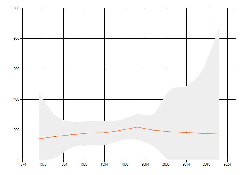 Gemiddelde trend van het aantal kilometerhokken waarin de soort voorkomt, weergegeven als indexcijfer (1975-1978 = 100). De trend is gecorrigeerd voor waarnemersinspanning en geeft de relatieve verandering in het aantal bezette kilometerhokken weer. Voor de berekening worden de data per periode van vier jaar samengenomen. In de grafiek correspondeert ieder punt met het laatste jaar van zo'n periode.