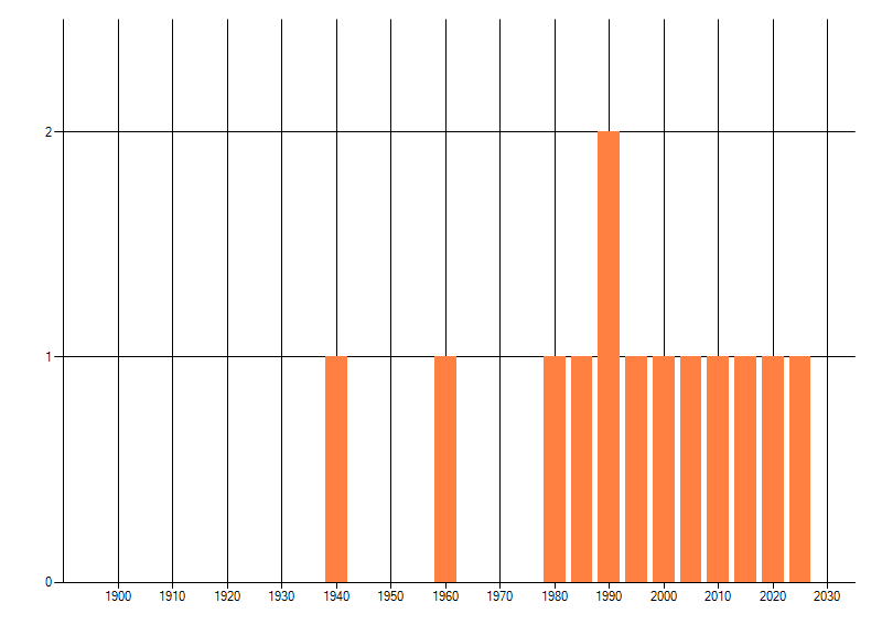 Het aantal atlasblokken (5x5 km) waarin de soort is gemeld binnen een periode van vijf jaar (vanaf 1980) of twintig jaar. Niet gecorrigeerd voor waarnemersinspanning en het aantal doorgegeven waarnemingen kan sterk variëren per periode, dus een trend in verspreiding kan hier niet direct uit worden afgelezen. Het opgegeven jaartal is het eerste jaar van de periode. Bron: gevalideerde waarnemingen uit de NDFF.
