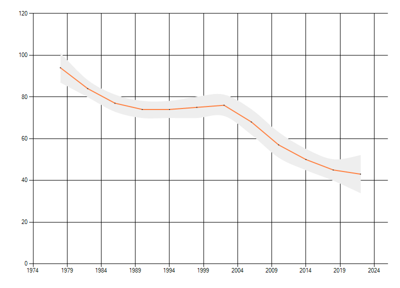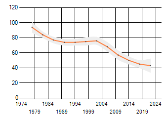 Gemiddelde trend van het aantal kilometerhokken waarin de soort voorkomt, weergegeven als indexcijfer (1975-1978 = 100). De trend is gecorrigeerd voor waarnemersinspanning en geeft de relatieve verandering in het aantal bezette kilometerhokken weer. Voor de berekening worden de data per periode van vier jaar samengenomen. In de grafiek correspondeert ieder punt met het laatste jaar van zo'n periode.
