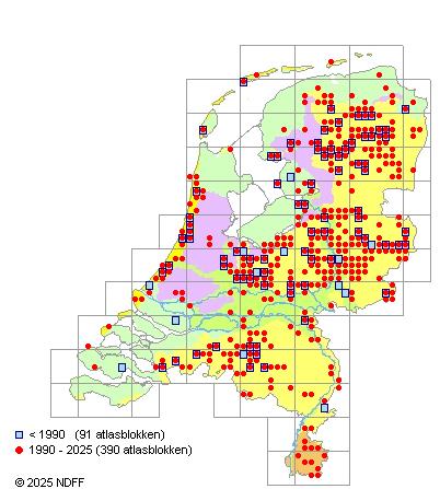 Het aantal atlasblokken (5x5 km) waarin de soort is gemeld binnen een periode van vijf jaar (vanaf 1980) of twintig jaar. Niet gecorrigeerd voor waarnemersinspanning en het aantal doorgegeven waarnemingen kan sterk variëren per periode, dus een trend in verspreiding kan hier niet direct uit worden afgelezen. Het opgegeven jaartal is het eerste jaar van de periode. Bron: gevalideerde waarnemingen uit de NDFF.