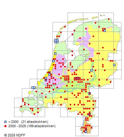 Het aantal atlasblokken (5x5 km) waarin de soort is gemeld binnen een periode van vijf jaar (vanaf 1980) of twintig jaar. Niet gecorrigeerd voor waarnemersinspanning en het aantal doorgegeven waarnemingen kan sterk variëren per periode, dus een trend in verspreiding kan hier niet direct uit worden afgelezen. Het opgegeven jaartal is het eerste jaar van de periode. Bron: gevalideerde waarnemingen uit de NDFF.