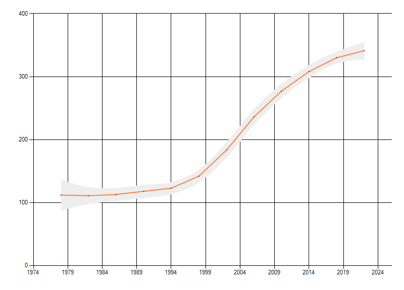 In de grafiek correspondeert ieder punt met het laatste jaar van zo'n periode.