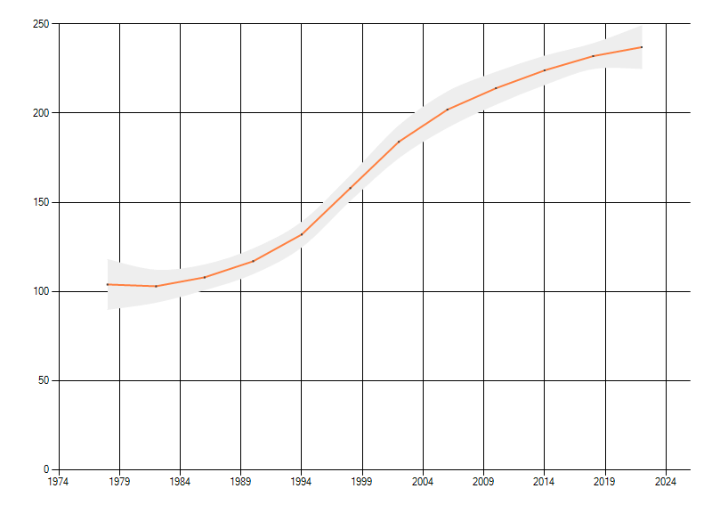 Gemiddelde trend van het aantal kilometerhokken waarin de soort voorkomt, weergegeven als indexcijfer (1975-1978 = 100).