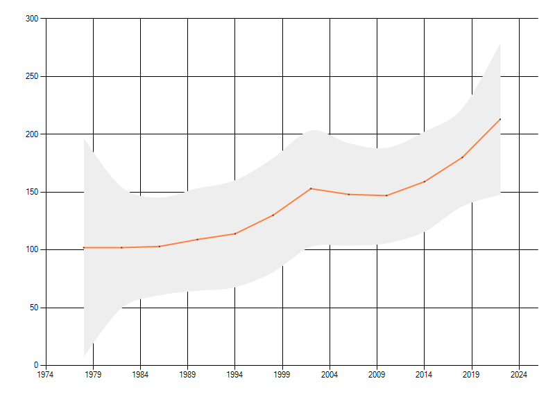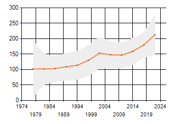 Gemiddelde trend van het aantal kilometerhokken waarin de soort voorkomt, weergegeven als indexcijfer (1975-1978 = 100).