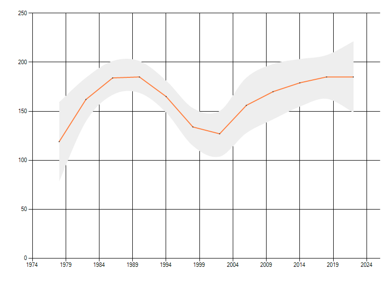 Gemiddelde trend van het aantal kilometerhokken waarin de soort voorkomt, weergegeven als indexcijfer (1975-1978 = 100).