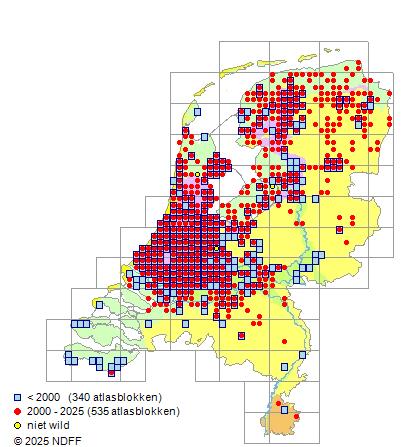 Gemiddelde trend van het aantal kilometerhokken waarin de soort voorkomt, weergegeven als indexcijfer (1975-1978 = 100). De trend is gecorrigeerd voor waarnemersinspanning en geeft de relatieve verandering in het aantal bezette kilometerhokken weer. Voor de berekening worden de data per periode van vier jaar samengenomen. In de grafiek correspondeert ieder punt met het laatste jaar van zo'n periode.