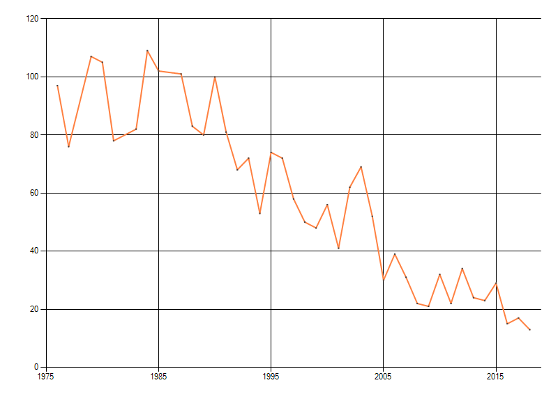 Gemiddelde trend van het aantal kilometerhokken waarin de soort voorkomt, weergegeven als indexcijfer (1975-1978 = 100). De trend is gecorrigeerd voor waarnemersinspanning en geeft de relatieve verandering in het aantal bezette kilometerhokken weer. Voor de berekening worden de data per periode van vier jaar samengenomen. In de grafiek correspondeert ieder punt met het laatste jaar van zo'n periode.