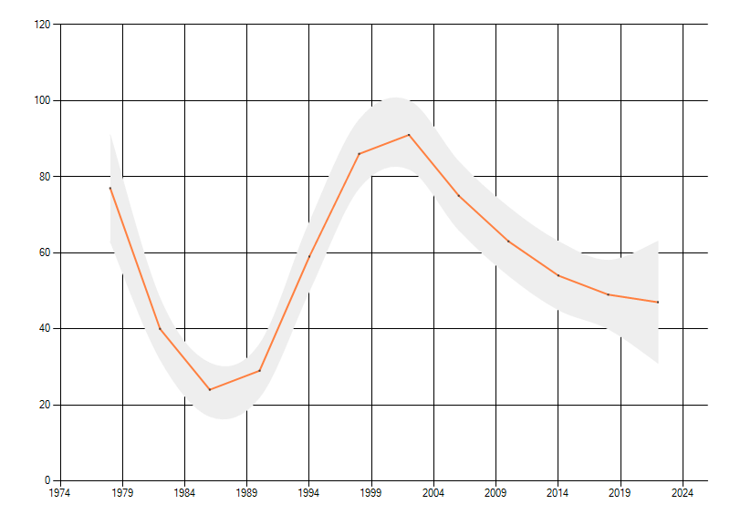 Gemiddelde trend van het aantal kilometerhokken waarin de soort voorkomt, weergegeven als indexcijfer (1975-1978 = 100). De trend is gecorrigeerd voor waarnemersinspanning en geeft de relatieve verandering in het aantal bezette kilometerhokken weer. Voor de berekening worden de data per periode van vier jaar samengenomen. In de grafiek correspondeert ieder punt met het laatste jaar van zo'n periode.