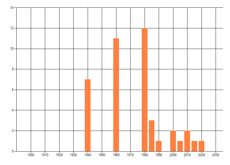 Het aantal atlasblokken (5x5 km) waarin de soort is gemeld binnen een periode van vijf jaar (vanaf 1980) of twintig jaar. Niet gecorrigeerd voor waarnemersinspanning en het aantal doorgegeven waarnemingen kan sterk variëren per periode, dus een trend in verspreiding kan hier niet direct uit worden afgelezen. Het opgegeven jaartal is het eerste jaar van de periode. Bron: gevalideerde waarnemingen uit de NDFF.