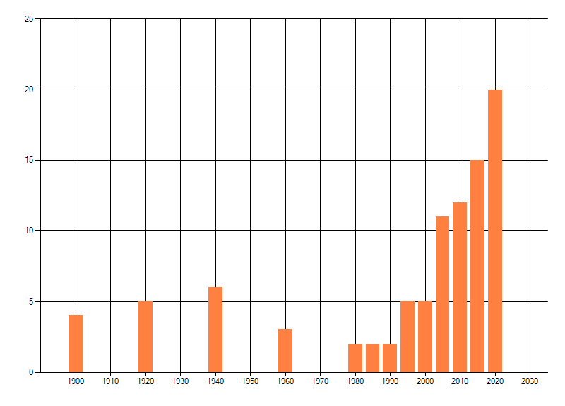 Het aantal atlasblokken (5x5 km) waarin de soort is gemeld binnen een periode van vijf jaar (vanaf 1980) of twintig jaar. Niet gecorrigeerd voor waarnemersinspanning en het aantal doorgegeven waarnemingen kan sterk variëren per periode, dus een trend in verspreiding kan hier niet direct uit worden afgelezen. Het opgegeven jaartal is het eerste jaar van de periode. Bron: gevalideerde waarnemingen uit de NDFF.