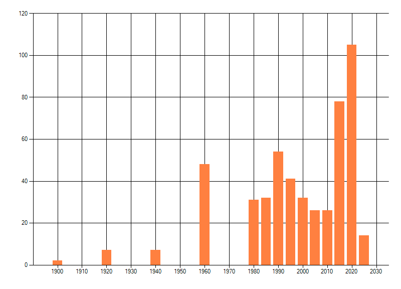 Het aantal atlasblokken (5x5 km) waarin de soort is gemeld binnen een periode van vijf jaar (vanaf 1980) of twintig jaar. Niet gecorrigeerd voor waarnemersinspanning en het aantal doorgegeven waarnemingen kan sterk variëren per periode, dus een trend in verspreiding kan hier niet direct uit worden afgelezen. Het opgegeven jaartal is het eerste jaar van de periode. Bron: gevalideerde waarnemingen uit de NDFF.