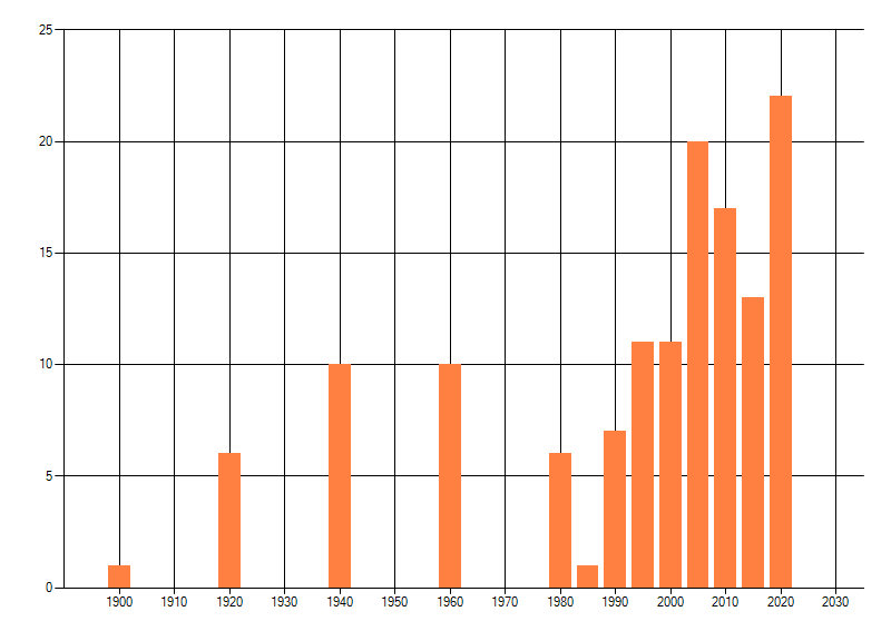 Het aantal atlasblokken (5x5 km) waarin de soort is gemeld binnen een periode van vijf jaar (vanaf 1980) of twintig jaar. Niet gecorrigeerd voor waarnemersinspanning en het aantal doorgegeven waarnemingen kan sterk variëren per periode, dus een trend in verspreiding kan hier niet direct uit worden afgelezen. Het opgegeven jaartal is het eerste jaar van de periode. Bron: gevalideerde waarnemingen uit de NDFF.